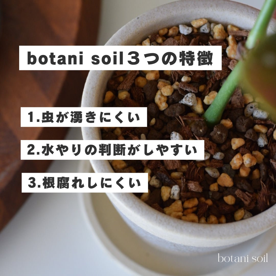 害虫は、腐葉土などの有機質の土から発生しやすいため、botani soilでは無機質の土で配合を行い、限りなく虫の発生を抑えてあります。