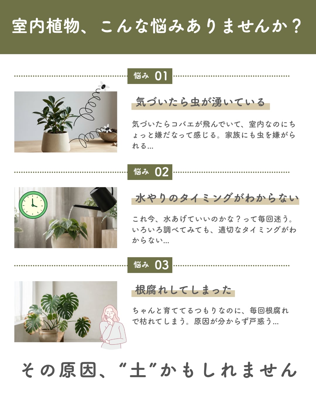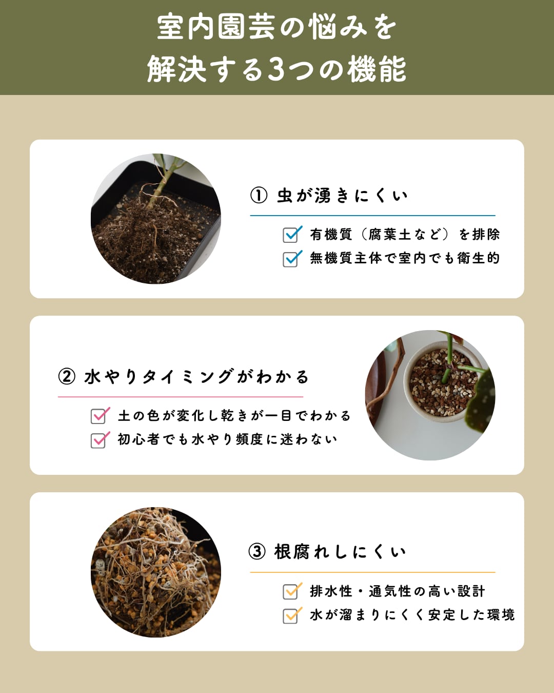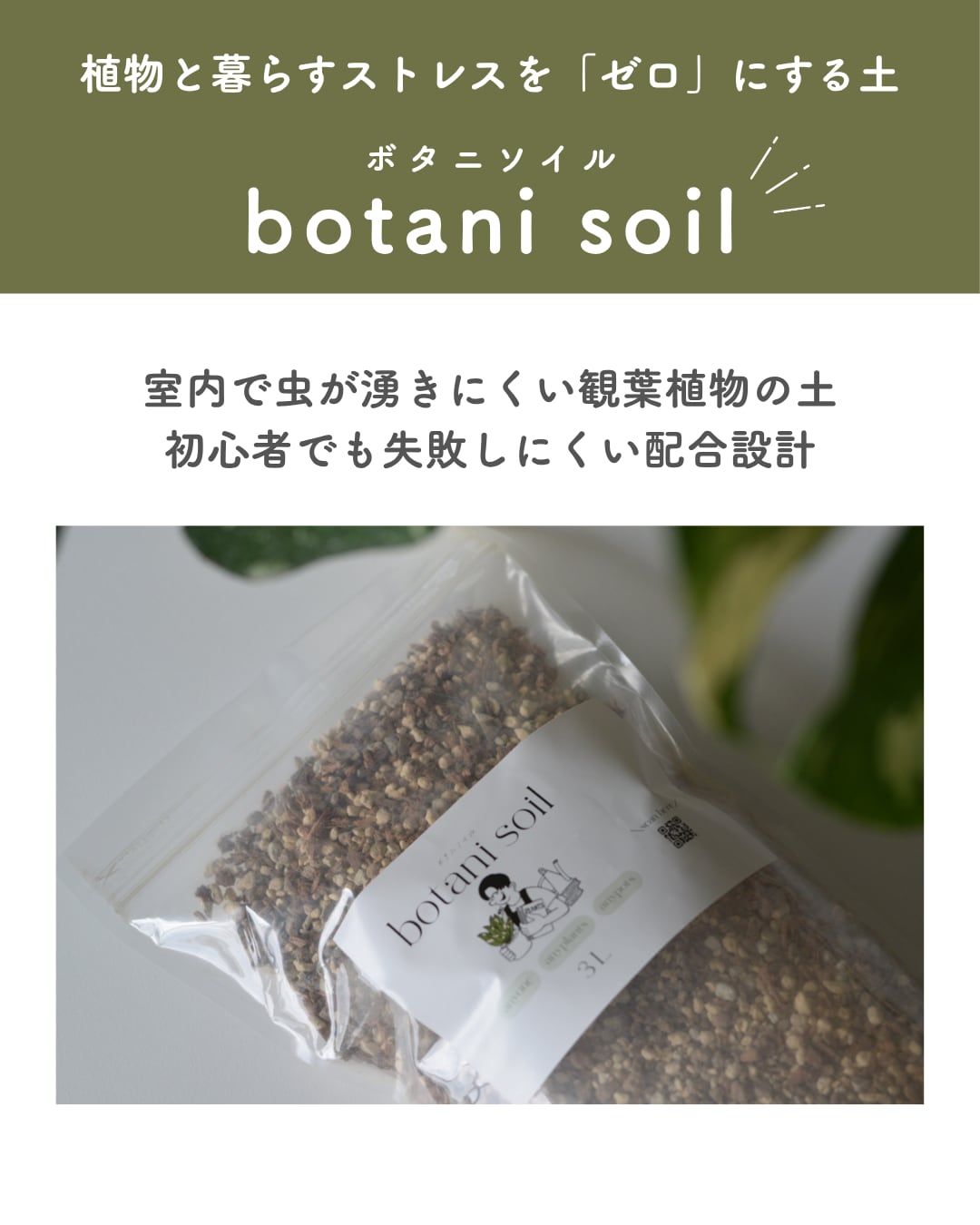 害虫は、腐葉土などの有機質の土から発生しやすいため、botani soilでは無機質の土で配合を行い、限りなく虫の発生を抑えてあります。